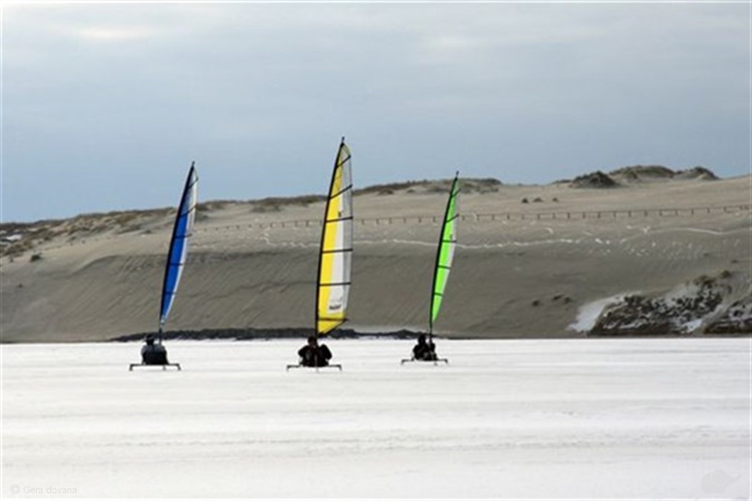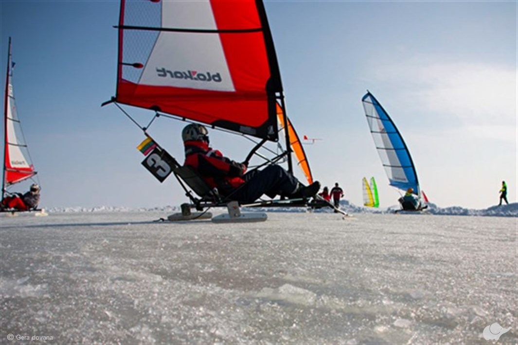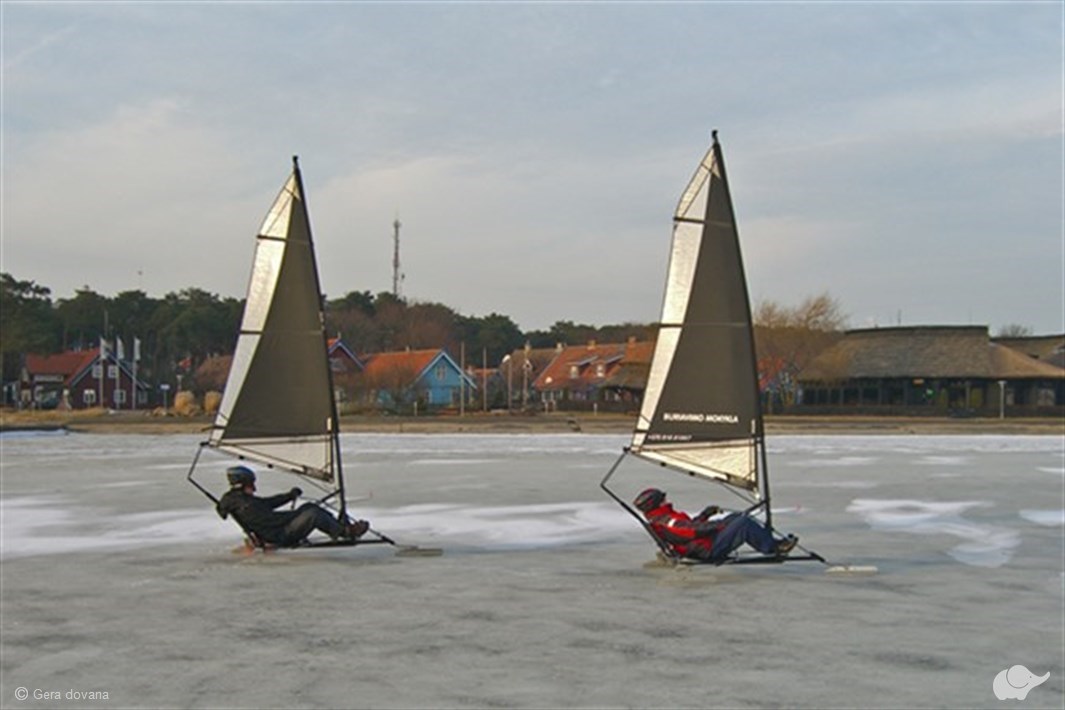 Kai Kuršių marios pasidengia ledu, smagu išbandyti buriavimą „Ice-Blokart“ ledrogėmis pajūryje!