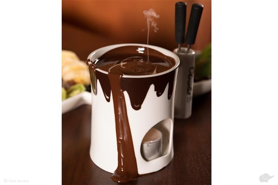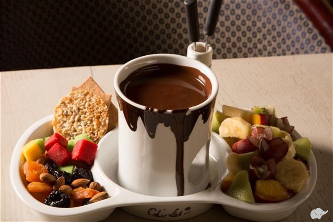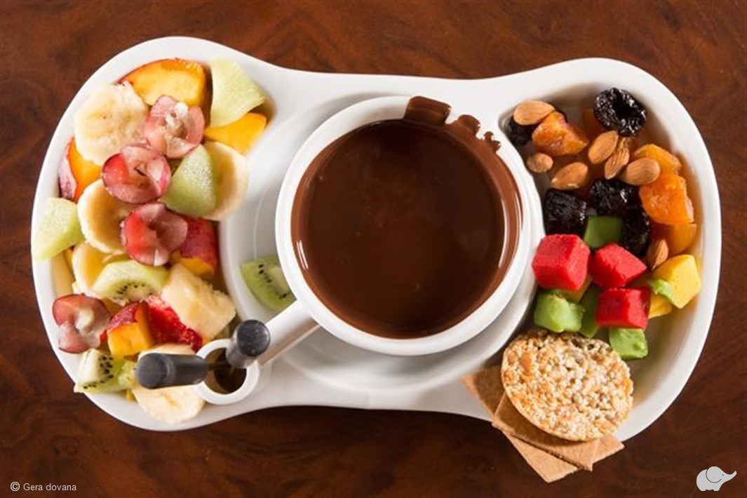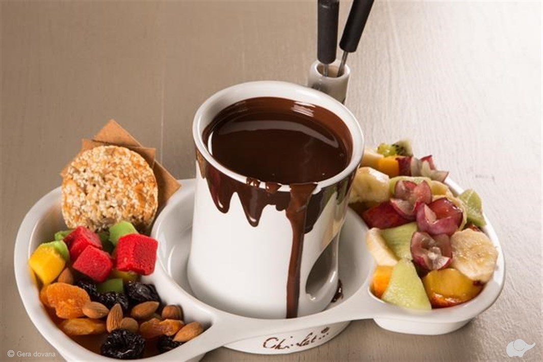 Vaisių asortimentas priklauso nuo sezono. Pasiūlymas galioja šokolado fondiu ir dviem bet kurioms pasiriktoms nealkoholinėms kavoms.