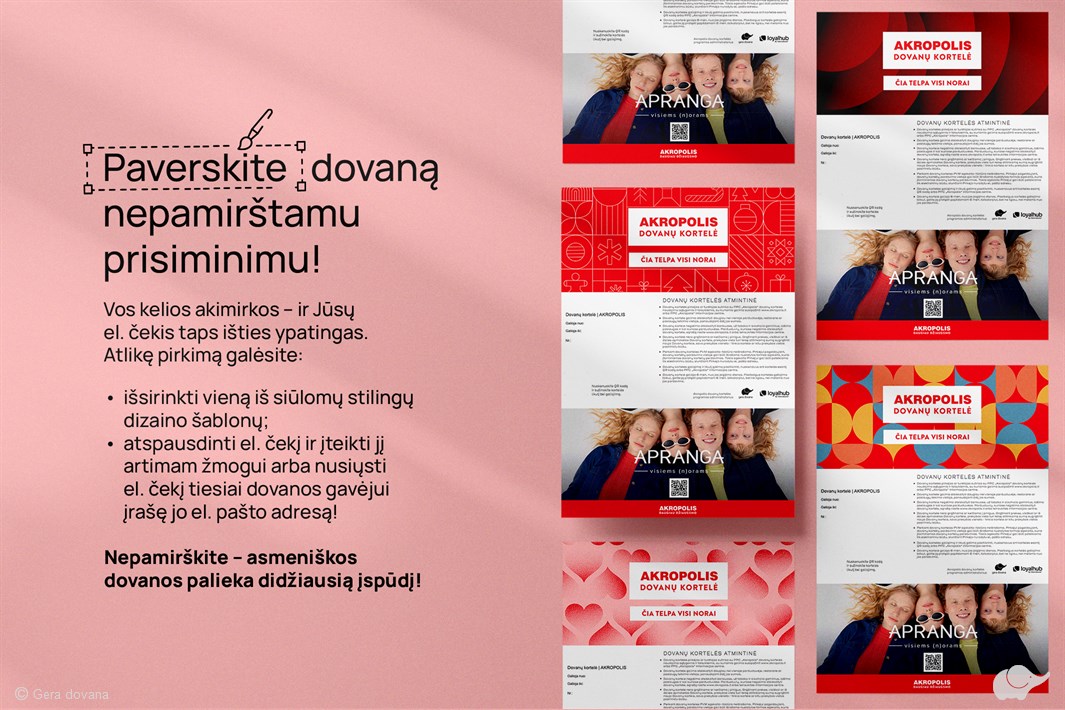 SVARBU! Įsigydami PPC „Akropolis” dovanų kortelę Jūs patvirtinate, kad susipažinote su dovanų kortelės naudojimo taisyklėmis.