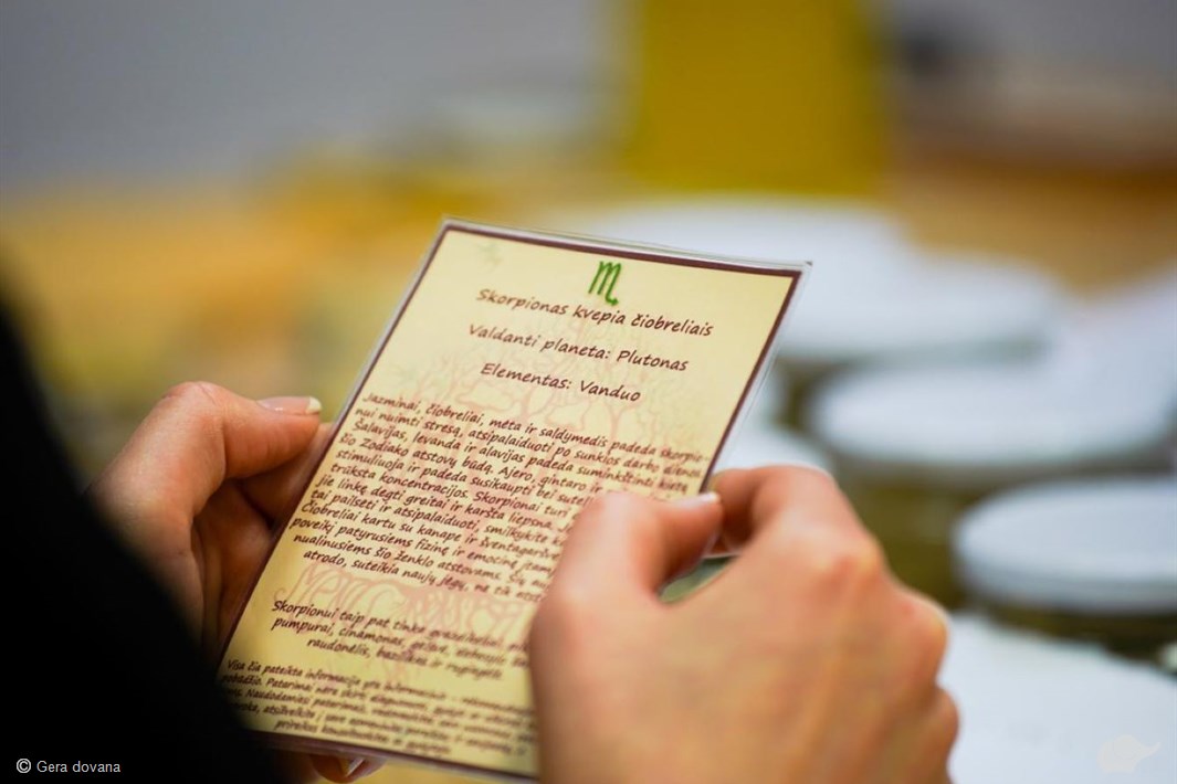 Kuriant kvepalus naudojami eteriniai aliejai – esant alergijų būtina informuoti iš anksto. Į šias dirbtuves svarbu atvykti nesikvėpinus. Registruojantis internetu reikia įvesti dovanų čekio brūkšninį kodą. Apie neatvykimą būtina informuoti el. paštu prieš 24 val., kitaip dovanų čekis bus laikomas panaudotu. Daugiau informacijos – www.artoteka.lt/registracija/ kursai.