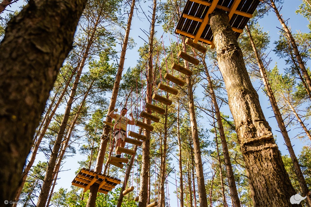 Nuotykių parkas „Miškas“ kviečia pramogauti medžių viršūnėse! Netoli Palangos įsikūrusio parko medžiuose įrengtos 5 trasos: žemiausias takas – vos 1 m aukščio, o aukščiausia trasa iškilusi net 15 m, tad įspūdžių netrūks nei mažiausiems dalyviams, nei ekstremalių pojūčių gerbėjams. Čia taip pat galima pajusti laisvąjį kritimą iš 20 m, linksmintis ant batutų, pasivažinėti traukinuku ir grožėtis parko augintiniais!