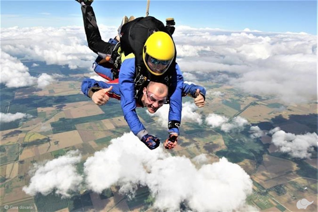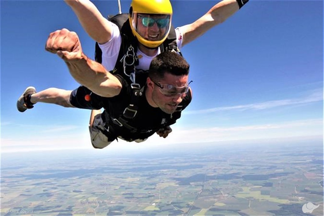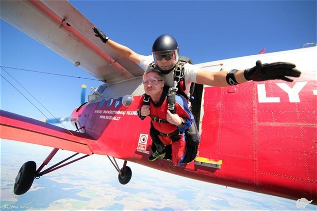 Tandeminis šuolis su instruktoriumi – pats paprasčiausias ir saugiausias būdas atlikti pirmąjį šuolį parašiutu ir pajusti laisvojo kritimo malonumą! Šuoliui naudojamas dvivietis sparno tipo parašiutas, skirtas instruktoriui ir keleiviui, kuriuos tarpusavyje jungia speciali diržų sistema. Kadangi šuolis atliekamas su instruktoriumi, pasiruošimas trunka tik apie 20 min. Pasiruošimo metu mokoma, kaip taisyklingai iššokti iš lėktuvo, ką daryti laisvojo kritimo metu bei kaip sėkmingai nusileisti. Nuo įlipimo į lėktuvą iki saugaus nusileidimo ant žemės visą laiką dovanos gavėju rūpinsis patyręs instruktorius.